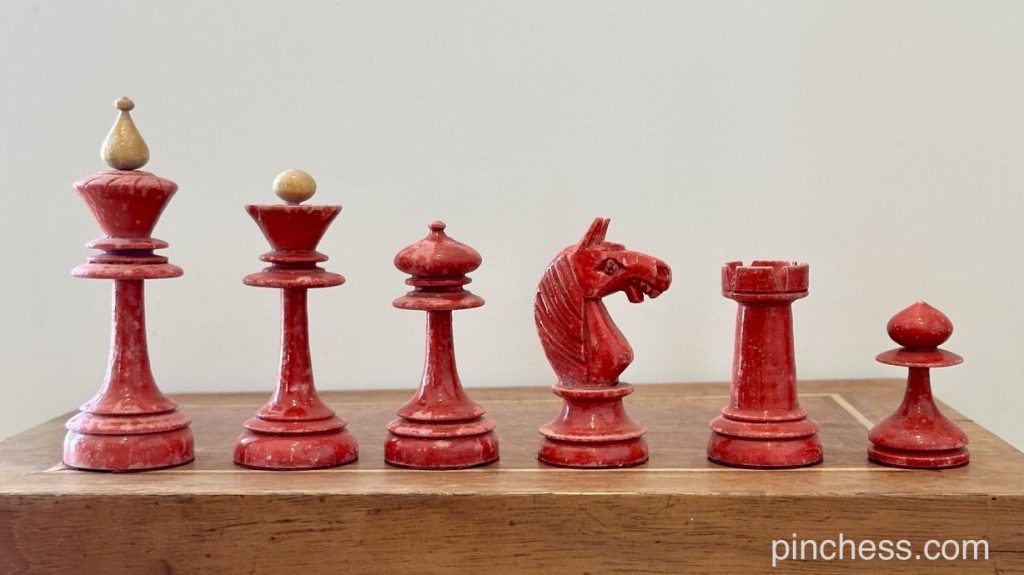 Изящные, маленькие, но при этом утяжеленные фигуры. Высота короля всего 7 см. В данном исполнении набор встречается гораздо реже чем такие же турнирные. Видимо выпущено их было существенно меньше и, из-за очень тонких стеблей фигур, до наших дней дожило в целости не много таких наборов. Достойный вариант в коллекцию. Был куплен в Москве, остался у родственников как наследство от деда краснодеревщика
